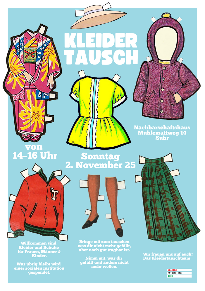 Hast Du Kleider, die Du nicht mehr tragen und gerne gegen neue eintauschen würdest? Kleidertausch ist die innovative und nachhaltige Art, sich neu einzukleiden oder ein paar neue Lieblingsstücke zu finden. Freiwillige der Quartierentwicklung Suhr führen erneut den Kleidertausch im Nachbarschaftshaus am Mühlemattweg 14 durch, am 2. November 2025, von 14 bis 16 Uhr. Es können Frauen- und Männerkleider, Kinderkleider sowie Accessoires wie Taschen, Schals, Schuhe etc. getauscht werden. Bitte nur gewaschene und noch gute Kleider mitbringen. Es ist keine Anmeldung erforderlich, die Durchführung ist kostenlos. Für das leibliche Wohl ist mit Getränken, Kaffee und Kuchen gesorgt. Wir freuen uns auf euch!