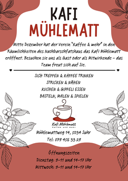 Das Kafi Mühlematt ist ein niederschwelliger Treffpunkt für die gesamte Suhrer Bevölkerung. Hier können Menschen jeden Alters und Hintergrunds zusammenkommen, sich austauschen und eine angenehme Zeit geniessen.